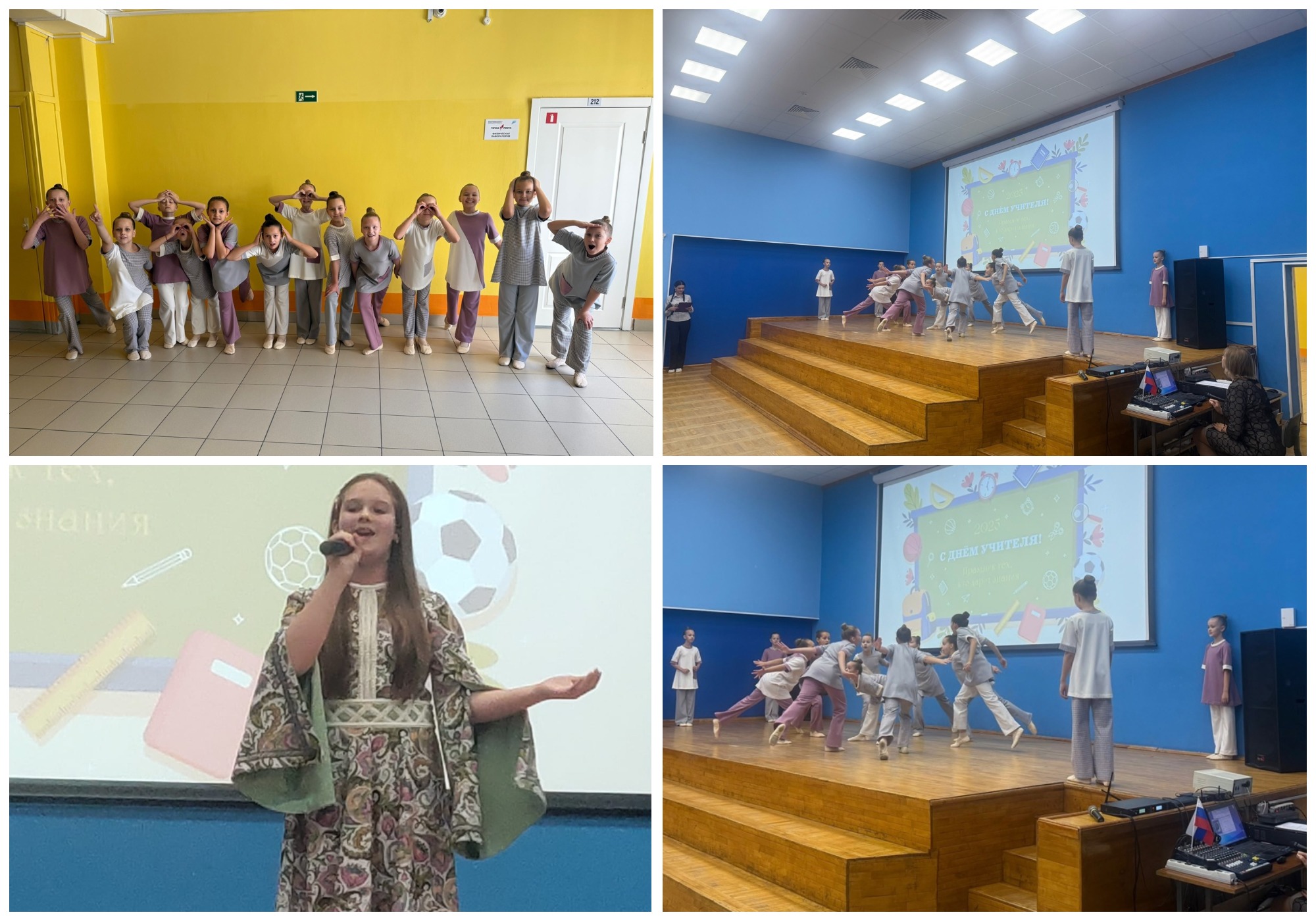 3 октября в Кингисеппской гимназии, в честь Дня учителя, на сцене блистал образцовый хореографический ансамбль "Ритмикс", под руководством Оксаны Алексеевны Качановской. Прекрасные песни исполнили Пелагея Федотова, ученица Елены Анатольевны Кучеренко, и София Колегова, ученица Екатерины Алексеевны Рупп.